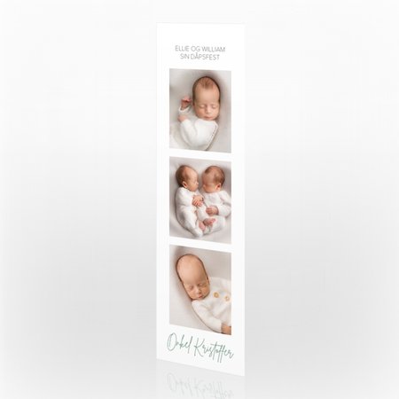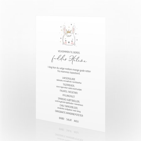 En meny på hver tallerken kan være så mye mer enn kun en enkelt meny! Vi kan trykke gjestens navn på kortet slik at det også fungerer som bordkort. Ha med en sang, koselige bilder, babyens første fakta, fun facts om de første månedene som familie, plass til en hilsen som samles inn osv. Valgene er mange