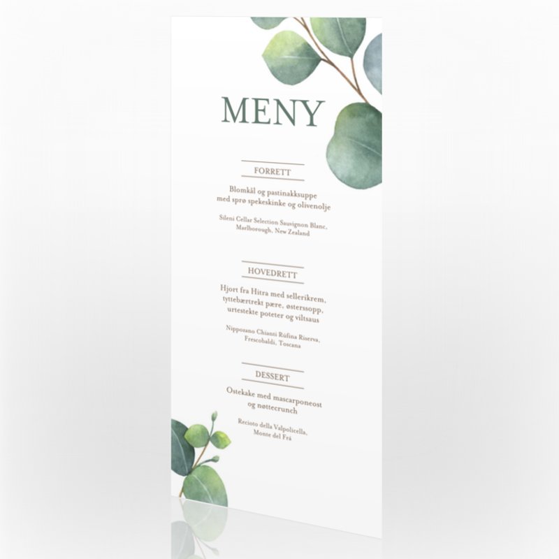 Menyen trykkes på et tykt, hvitt papir. Mot et tillegg kan du velge et av våre designpapir og å få gjestens navn trykt på, slik at menyen også brukes som bordkort.